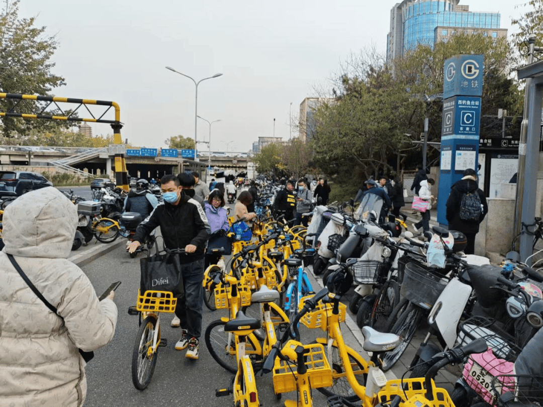 在西钓鱼台站C口外看到,使用非机动车接驳地铁的乘客不少,现场值守人员正引导乘客将车辆有序停放,站外环境有了很大好转。