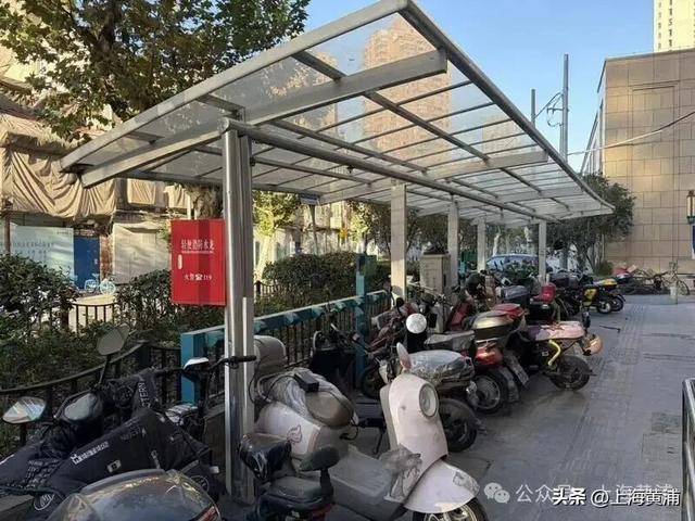 毗邻新天地东台里的黄浦众鑫城小区虽有地下车库,但由于早期设计未配置电动自行车充电区域,且与机动车混用,地面停车棚反而成了实际使用主阵地。此次改造中,小区集中在棚区安装了悬挂式干粉灭火装置与轻便水龙箱,实现“设备可视、操作可达”,也展现了在“非理想空间条件下”的现实应变能力。