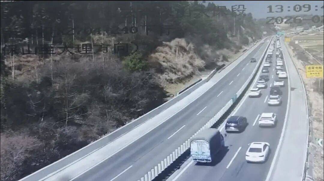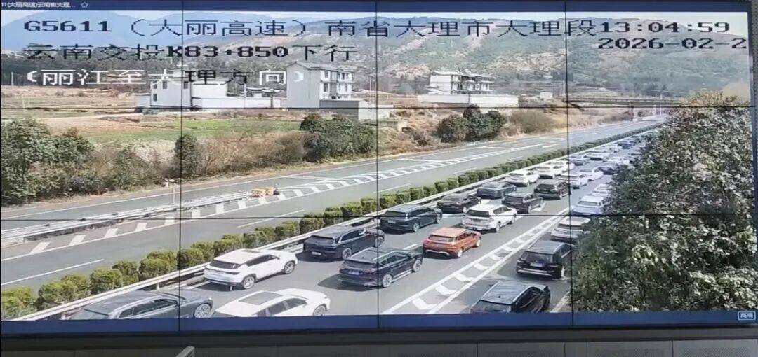 截至2026年2月22日13时04分,大丽高速丽江往大理方向K81+000(下山口隧道内)发生车辆追尾事故,因现场处置需要,临时中断此路段丽江往大理方向交通,车辆在下山口隧道入口截留。受事故影响,牛街至邓川路段车流量大,车辆通行缓慢。