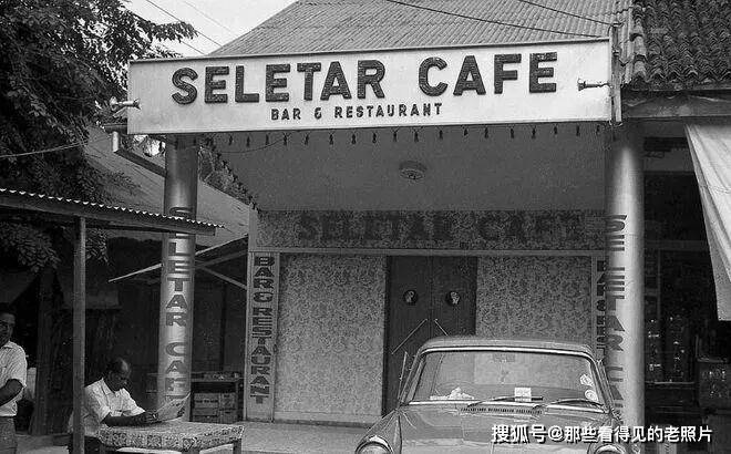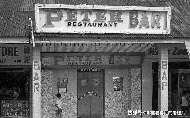 新加坡圣马旺,正门门头是双层立体发光招牌PETER BAR RESTAURANT(彼得餐吧酒吧),是当年南洋小镇热门的西式休闲餐饮场所;红白条纹雨篷、马赛克墙面、双开门迎宾设计,是 70 年代南洋临街商铺经典装修风格。