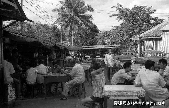 新加坡英国海军基地Sembawang外的村庄,沿街连片露天食摊、敞开式茶餐桌椅,当地华人街坊围坐喝茶闲聊、吃饭聚会,是当年南洋最经典的露天茶室 。