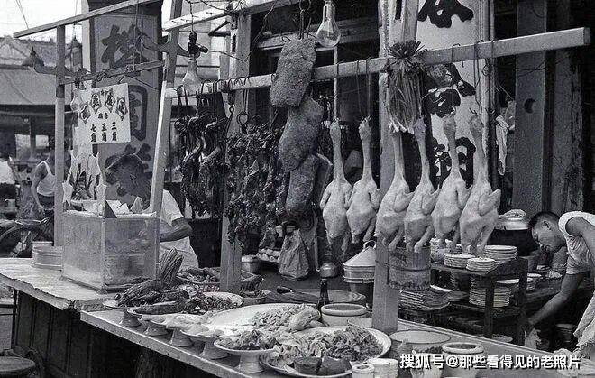 新加坡艾伯特街的一家铺面,悬挂着烧肉烧鹅,是南洋华人经典熟食招牌。台面上摆满切配好的凉拌菜、卤味、酱料,摊位上方挂着繁体中文招牌,完整还原了当年华人熟食摊的真实经营场景。