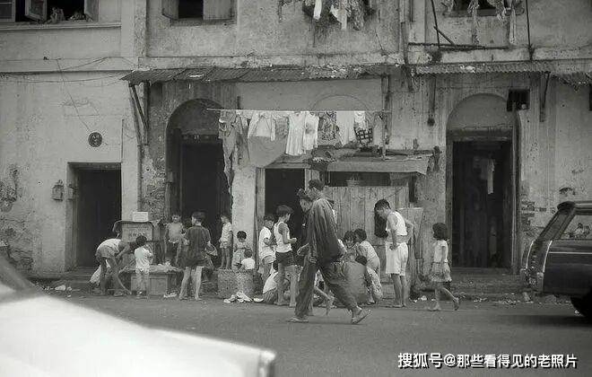 老房子门前街道上聚集着成群华人孩童与街坊邻里,孩子们自由在街边玩耍嬉戏、大人闲谈忙碌,没有精致小区围栏,家门口就是玩耍天地,完整定格当年南洋华人老街最松弛、最烟火的原生童年日常。沿街晾晒衣物、竹编箩筐杂物,都是当年普通华人家庭最真实的生活痕迹。