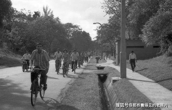 工人们从新加坡的森巴旺港骑自行车回家。这是新加坡经济刚刚起飞 的 60 年代。当时私家车尚未普及,自行车是底层工薪族最主要、最普遍的通勤交通工具。成群结队的工人骑行上下班,是当年新加坡郊外工业区最标志性的街头景象。